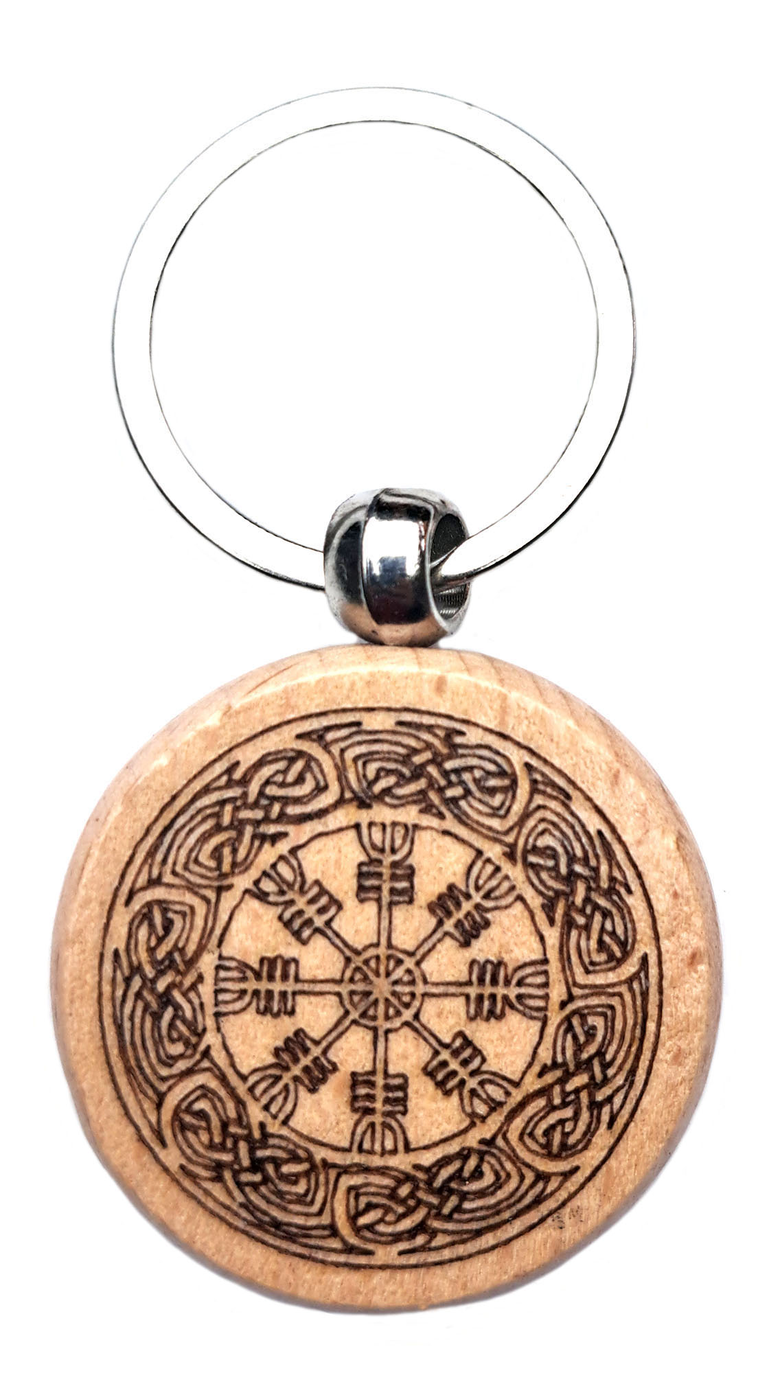 El símbolo grabado en este llavero es el Ægishjálmur (también conocido como el Yelmo del Asombro o Helm of Awe), un símbolo mágico nórdico/vikingo.