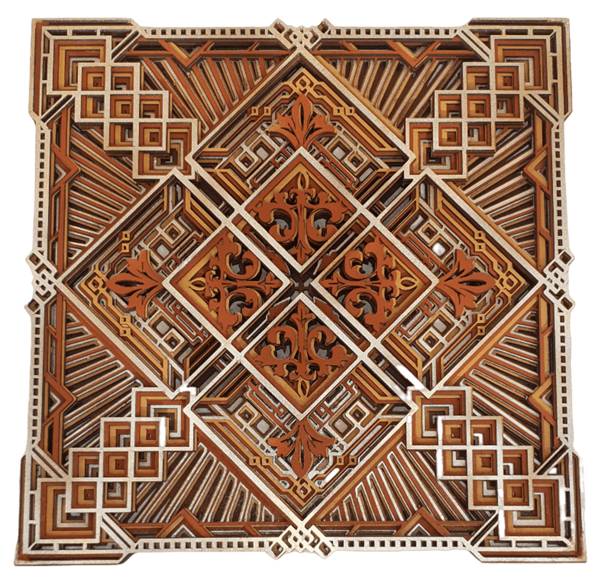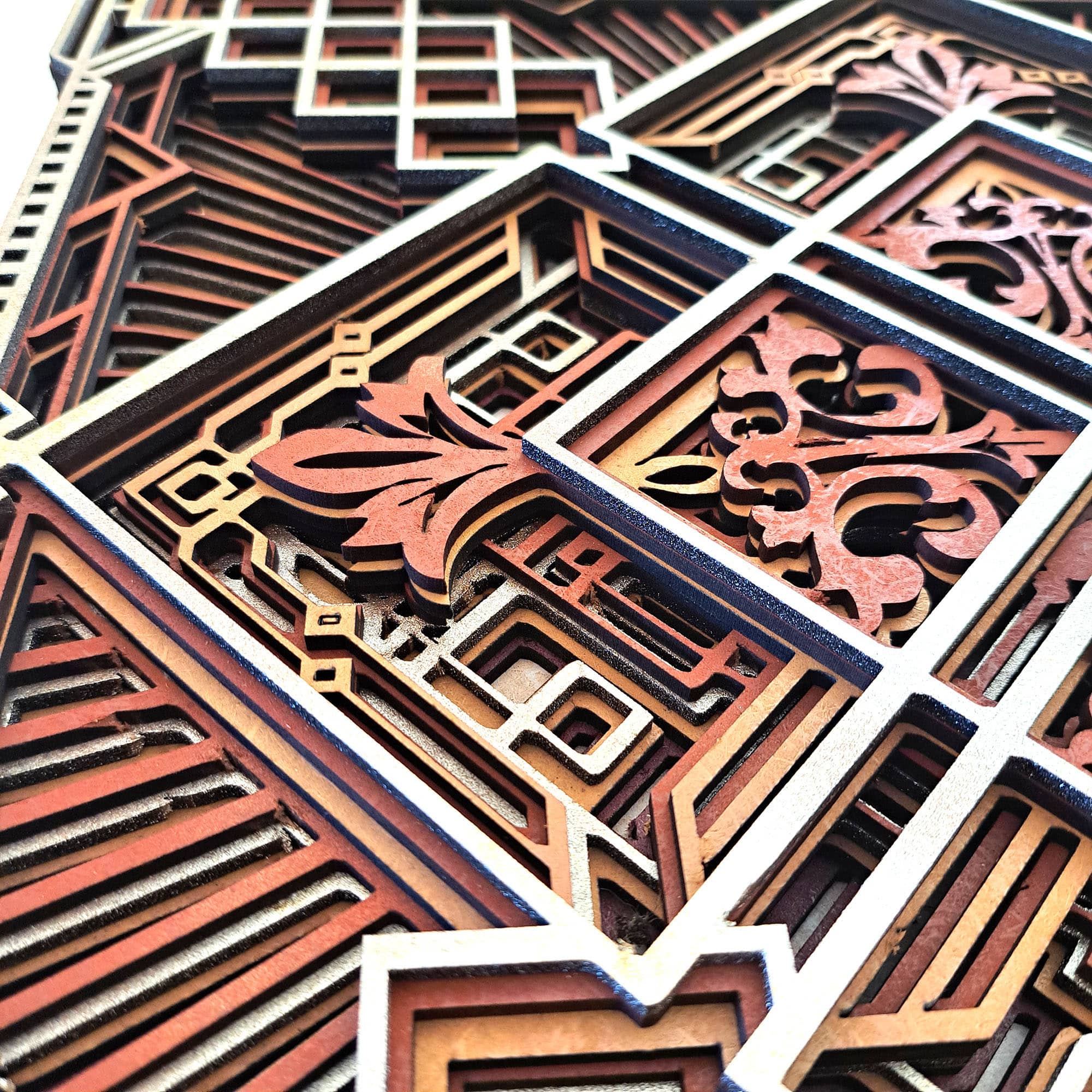 Cada capa de este mandala ha sido diseñada con precisión, creando un efecto tridimensional que invita al espectador a explorar visualmente sus intrincados patrones y símbolos. La riqueza de detalles y la profundidad de las capas añaden una dimensión de complejidad y belleza, haciendo de este mandala una obra de arte verdaderamente única.