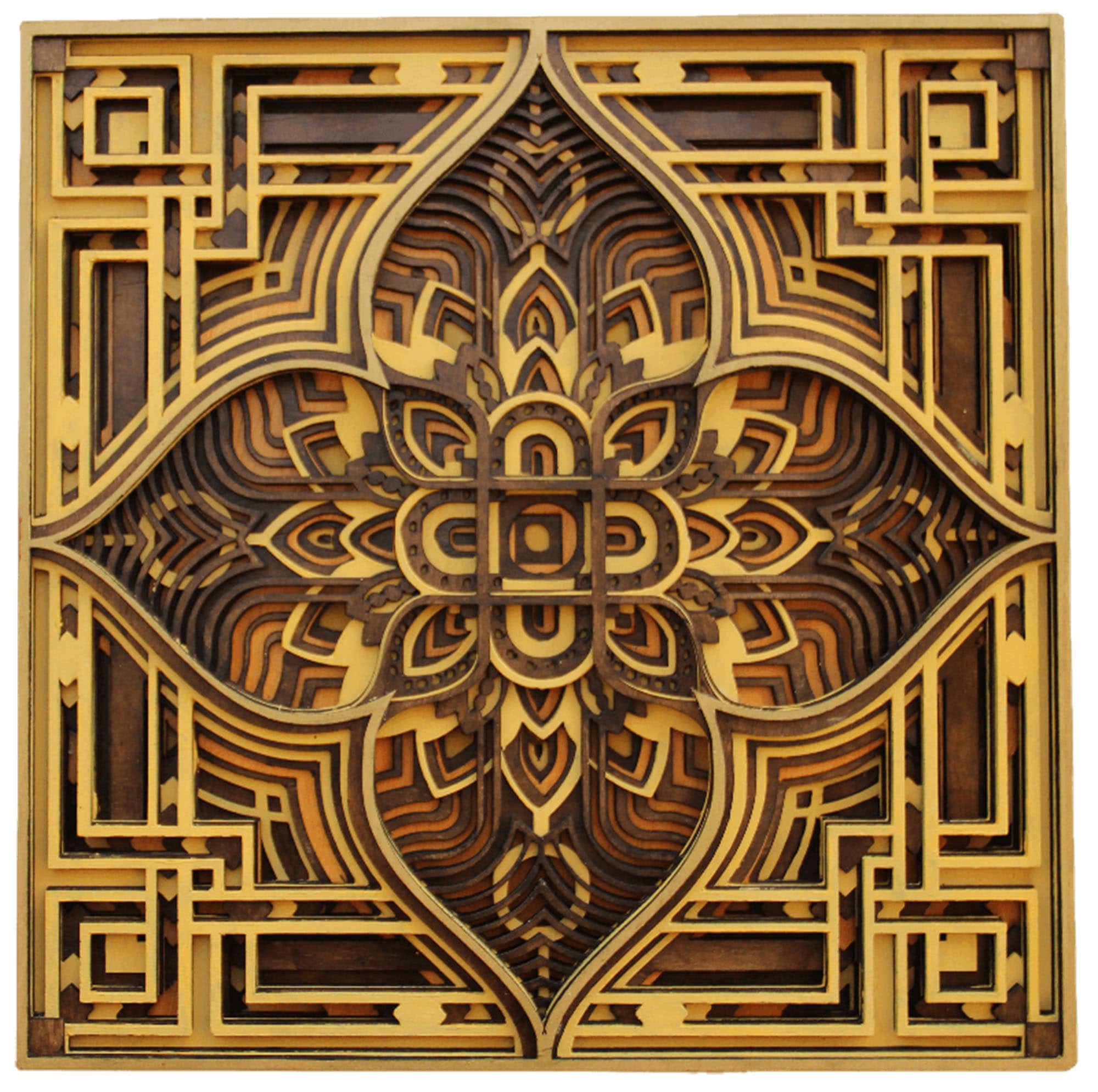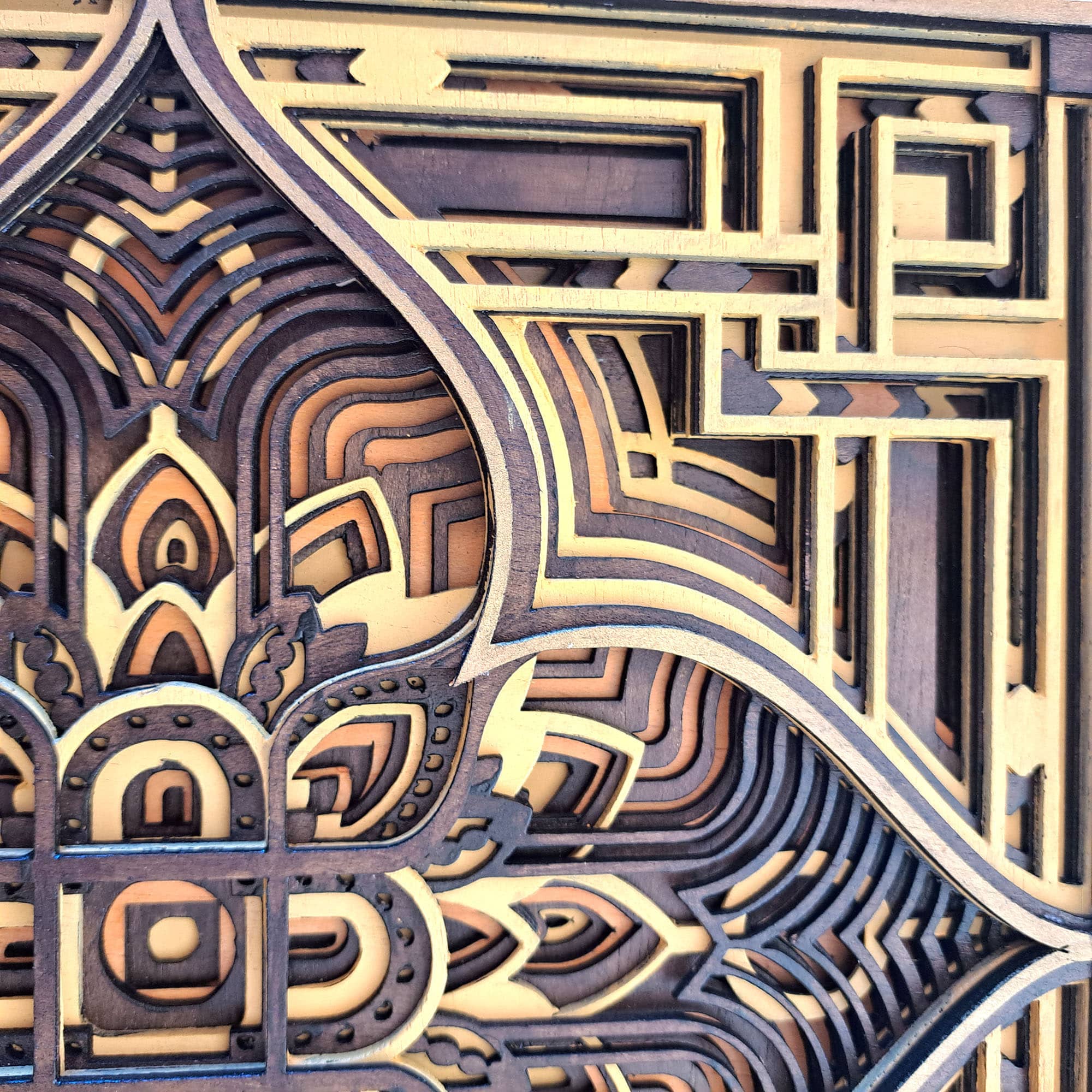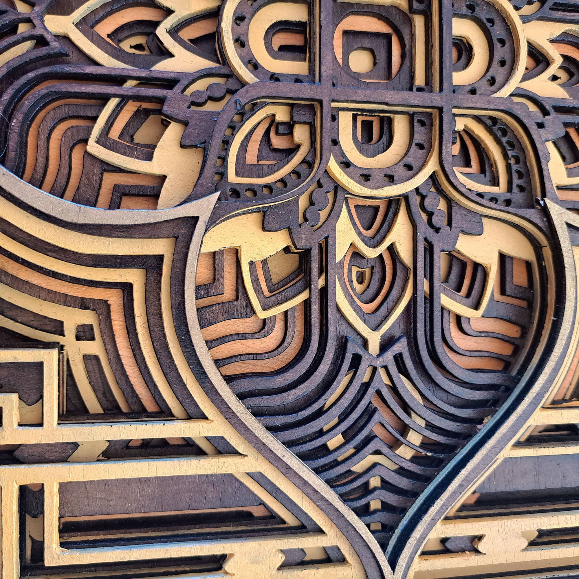 Creado a partir de madera de la más alta calidad, este mandala se caracteriza por su diseño de varias capas, que añade una profundidad y una complejidad visual fascinantes. Cada capa ha sido cuidadosamente tallada y ensamblada, revelando patrones intrincados y simbología espiritual que invitan a la contemplación.