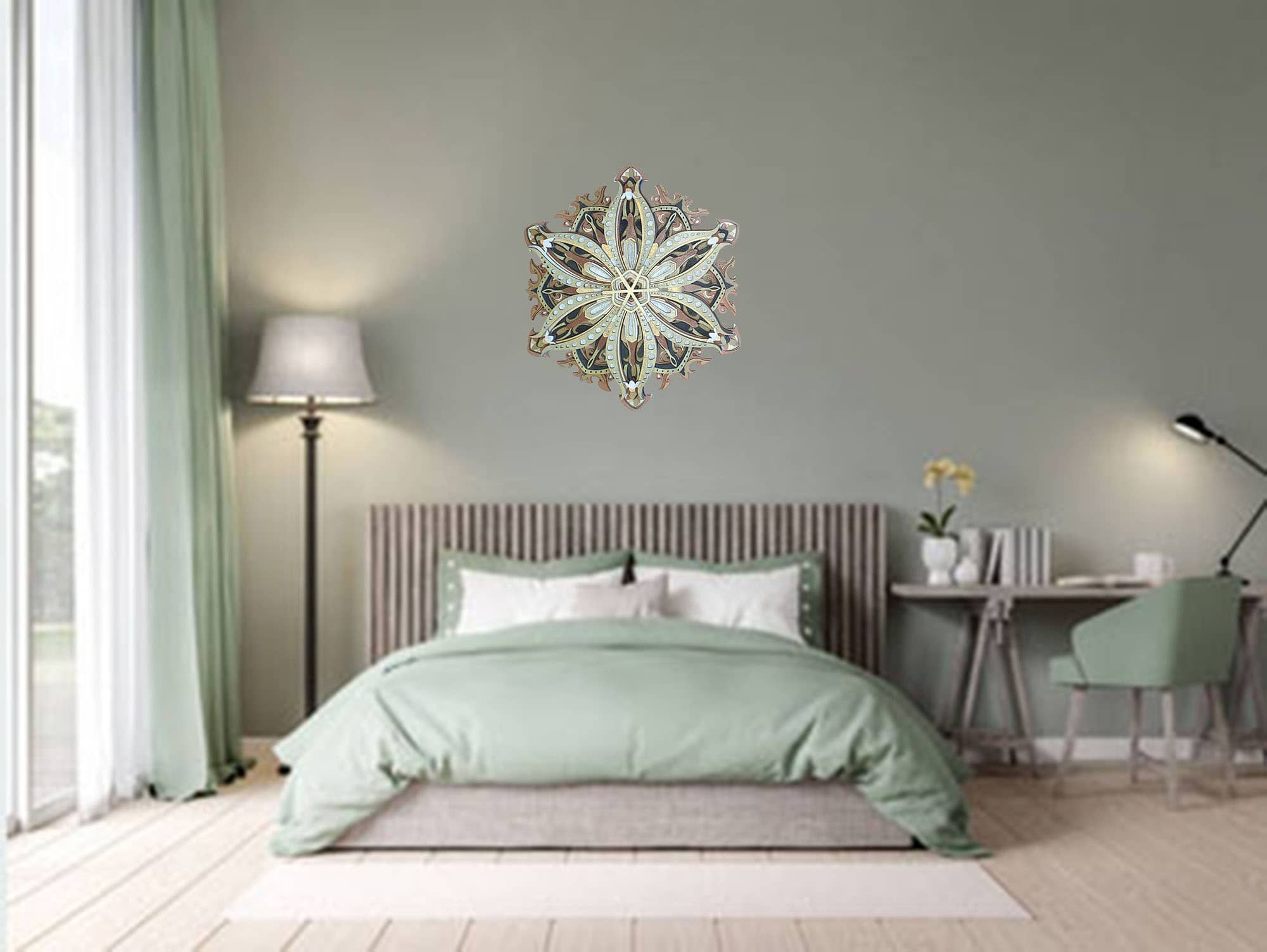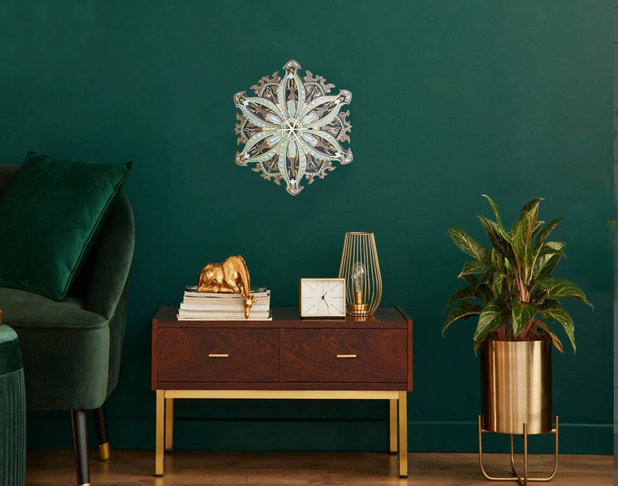 Esta pieza no solo captura la esencia de la tradición mandálica, sino que también incorpora un toque de modernidad en su estética, lo que la convierte en un complemento perfecto para cualquier estilo decorativo, desde el más tradicional hasta el más contemporáneo. Su diseño multicapa no solo es un festín para los ojos, sino que también simboliza los múltiples niveles de conciencia y la complejidad del universo, invitando a los espectadores a un viaje de descubrimiento interior.