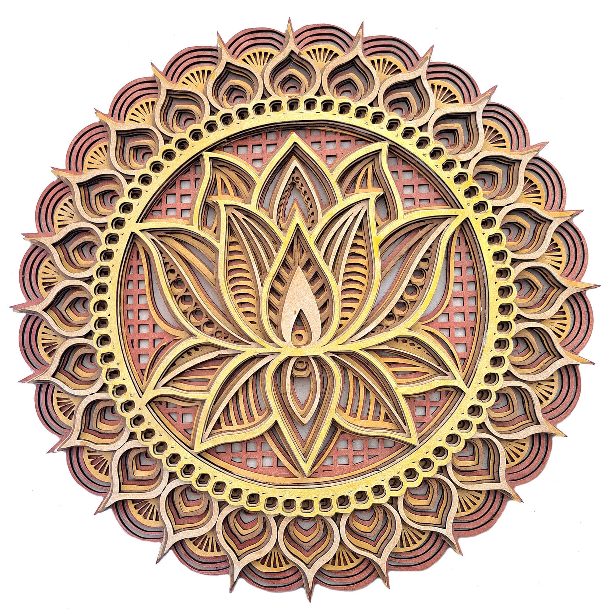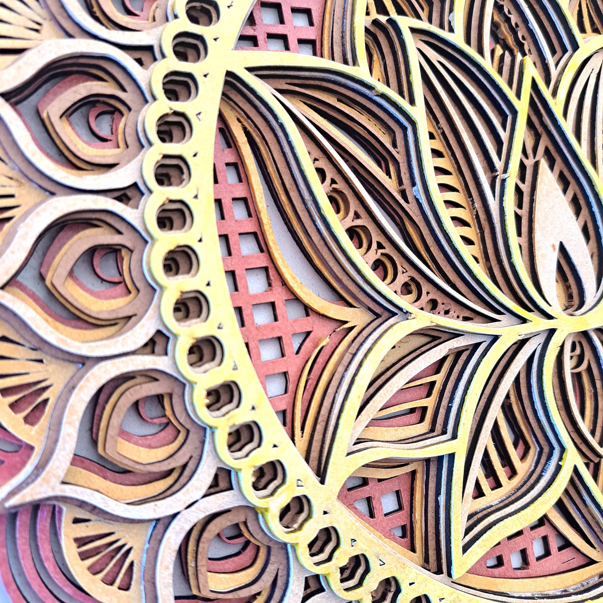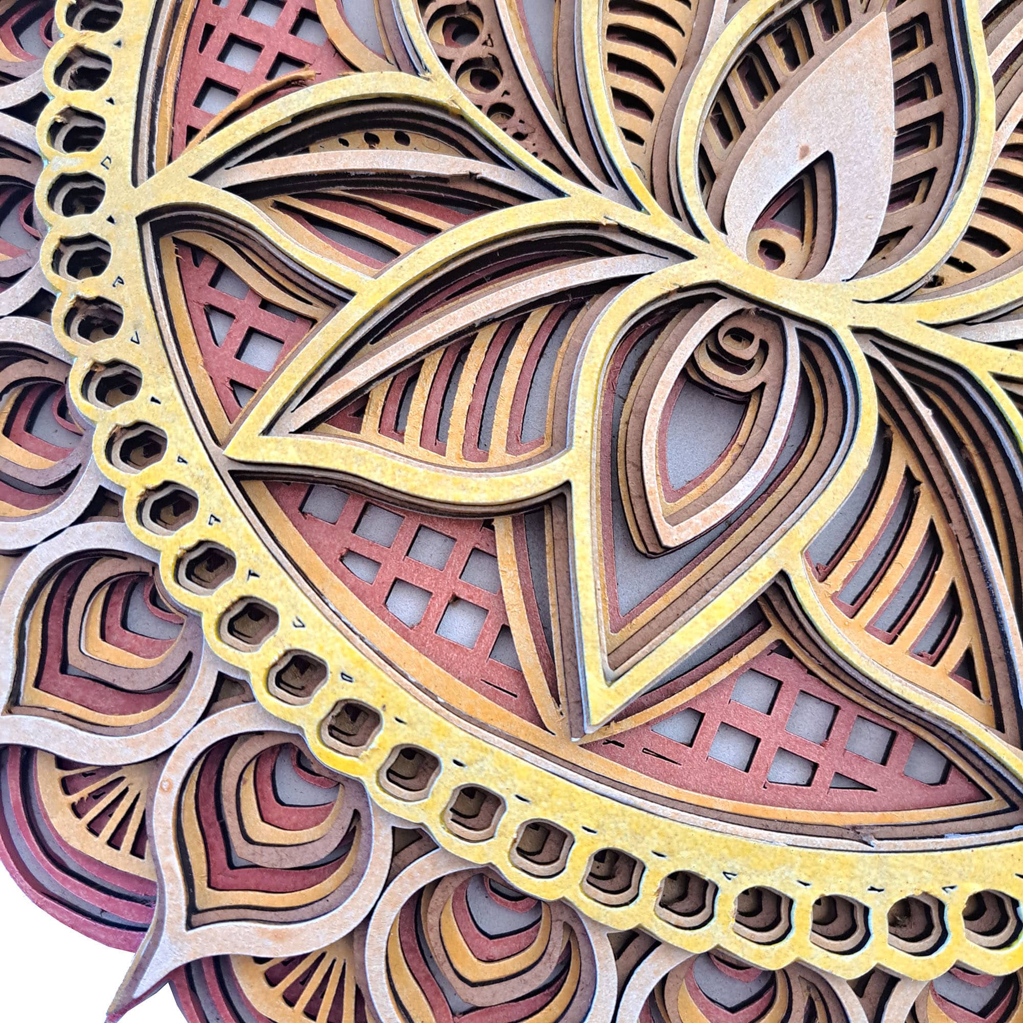 Cada capa de este mandala ha sido diseñada con precisión, creando un efecto tridimensional que invita al espectador a explorar visualmente sus intrincados patrones y símbolos. La riqueza de detalles y la profundidad de las capas añaden una dimensión de complejidad y belleza, haciendo de este mandala una obra de arte verdaderamente única.